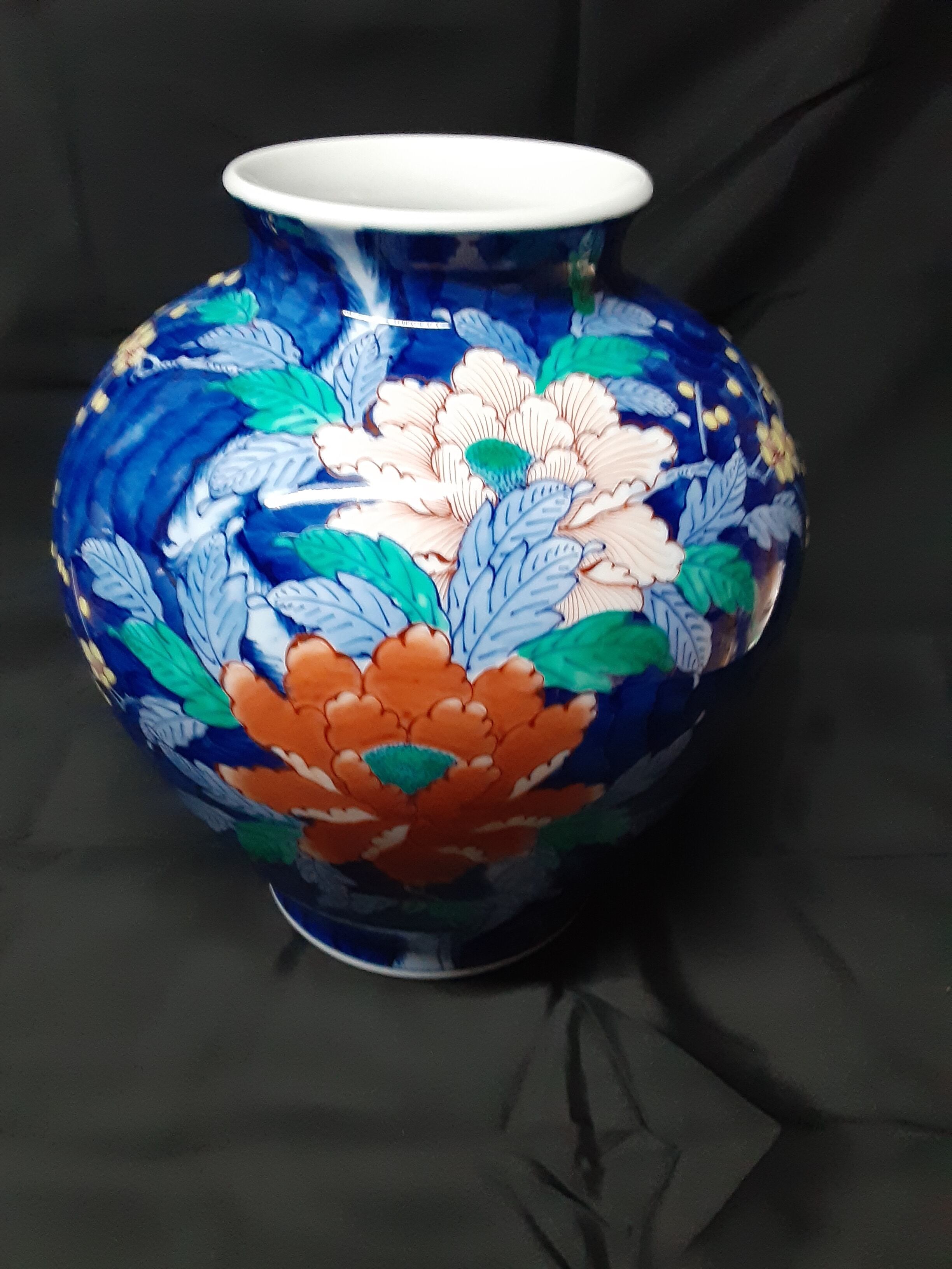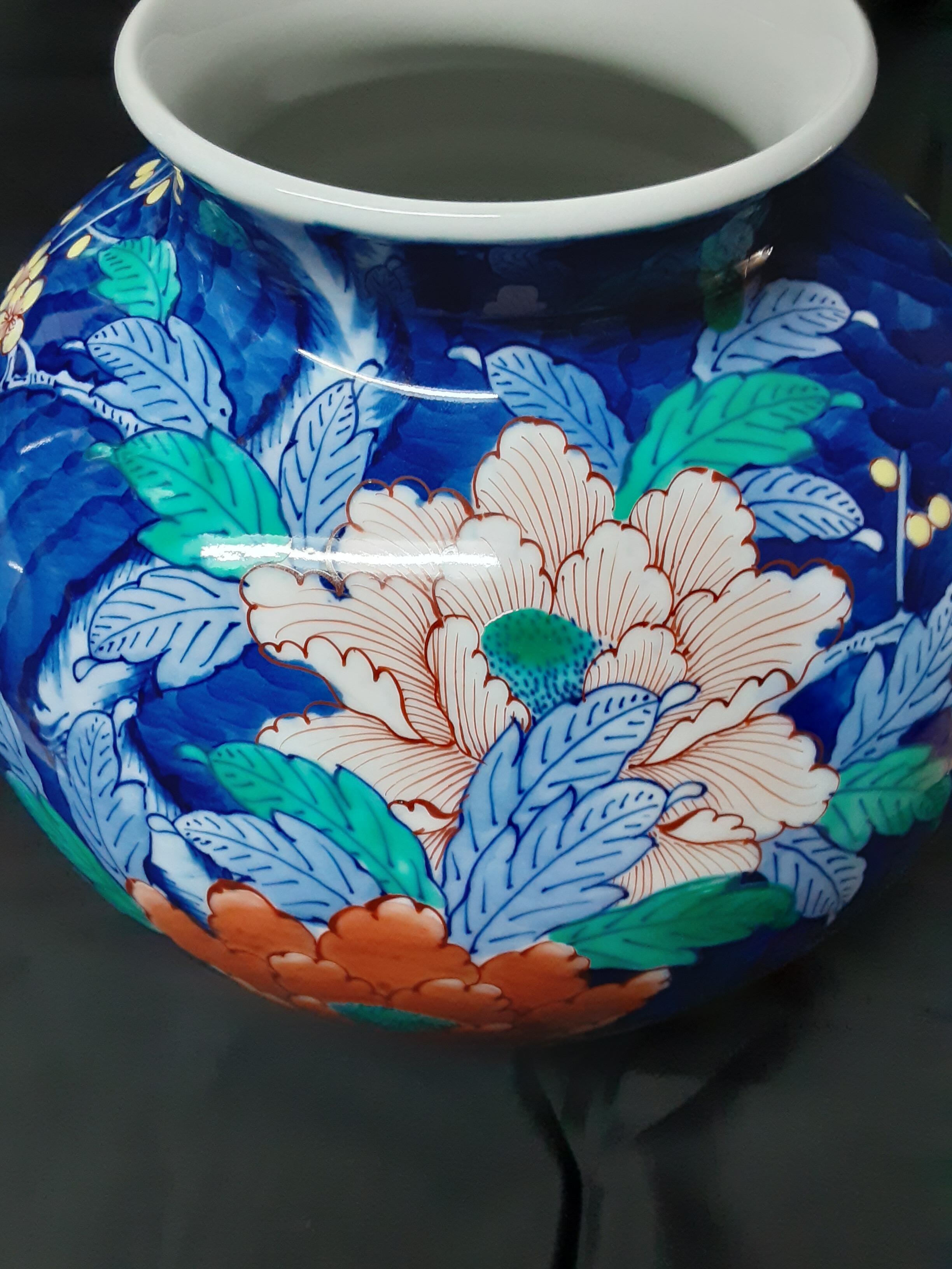 花瓶全体が鮮明な濃青で彩られる中に、艶やかに梅牡丹が描かれています。