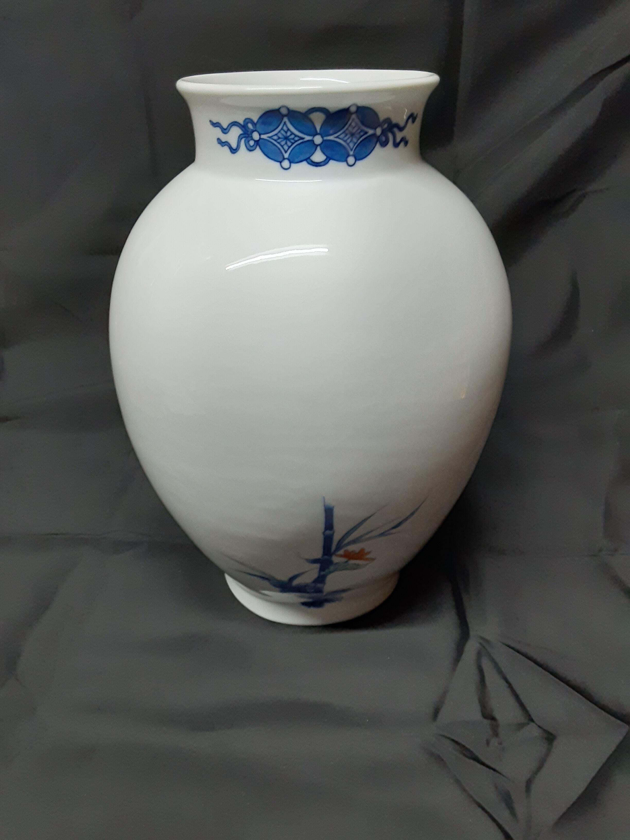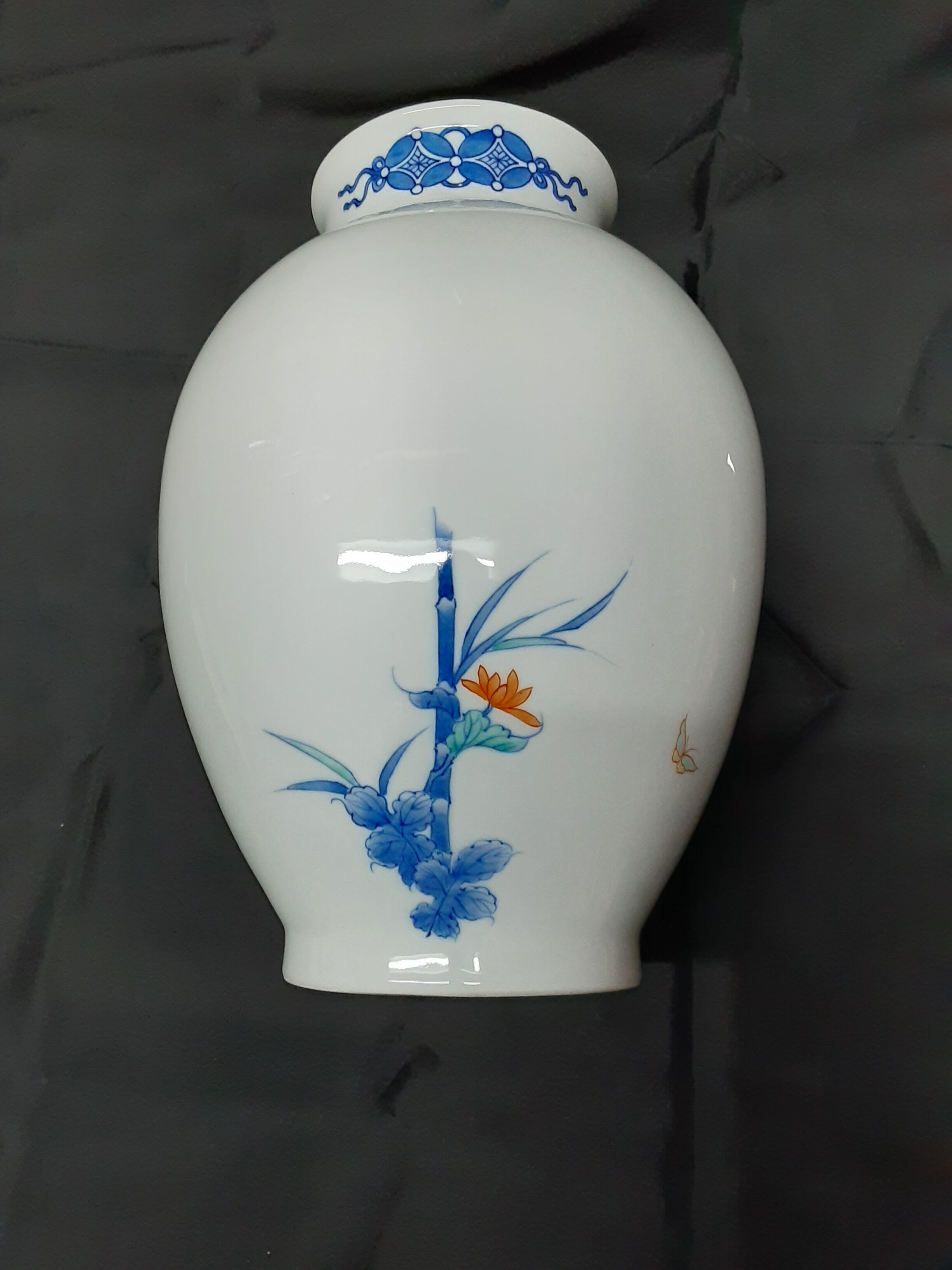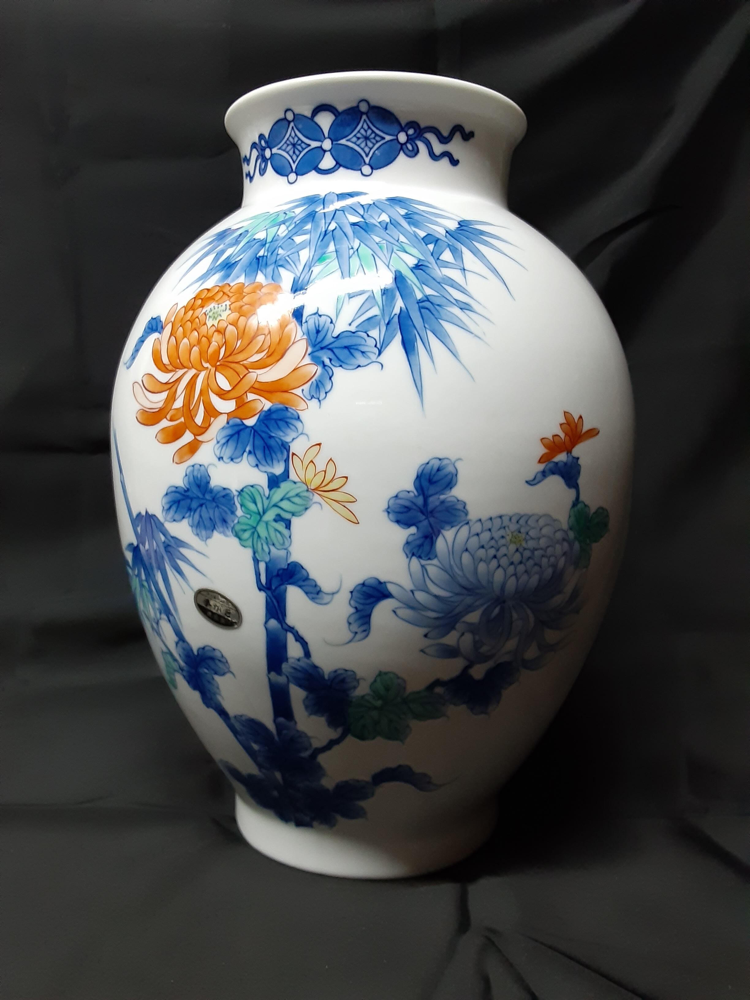 柔らかいタッチで描かれた菊の花、対照的に鋭いタッチで手を切ってしまう様な笹の葉を見事に色鍋島伝統の色彩で描かれています。