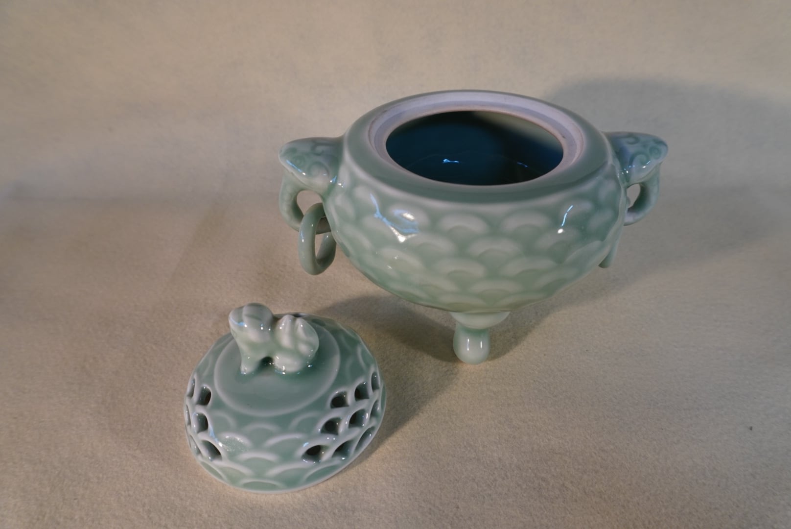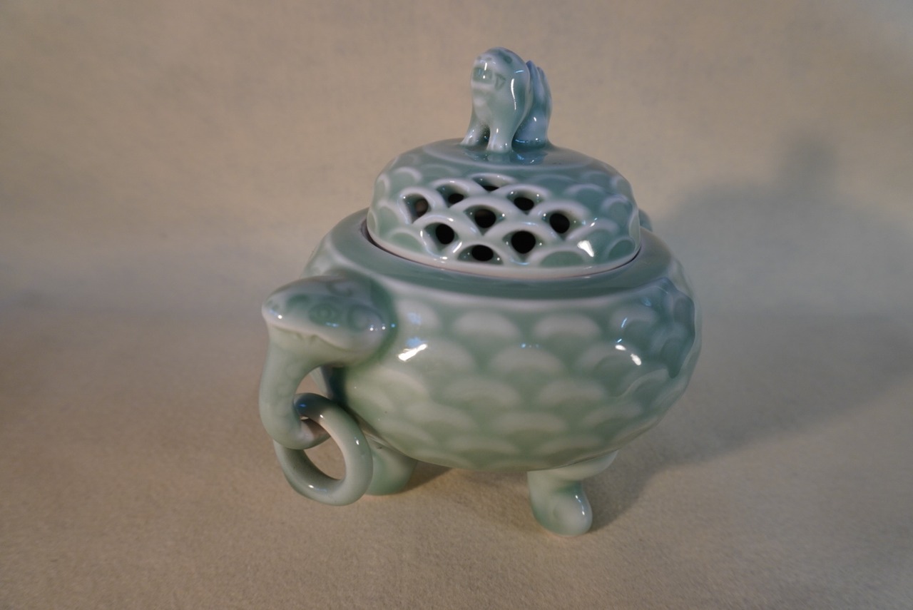 香炉全体が丸みを帯び、柔らかな印象を与えてくれる特徴的な青磁香炉です。