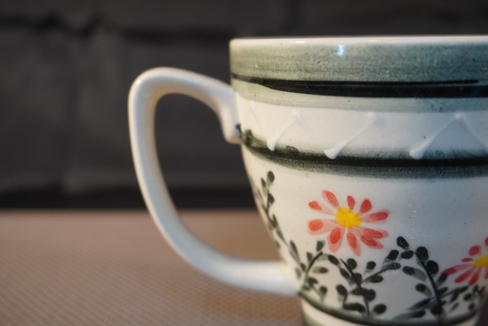 広口で取っ手も握りやすく、日々の生活を華やかに彩ってくれるマグカップです。