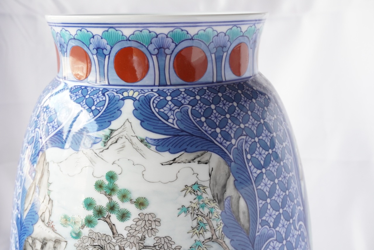 色鍋島染錦地紋山水三方割花瓶 花井山泉作